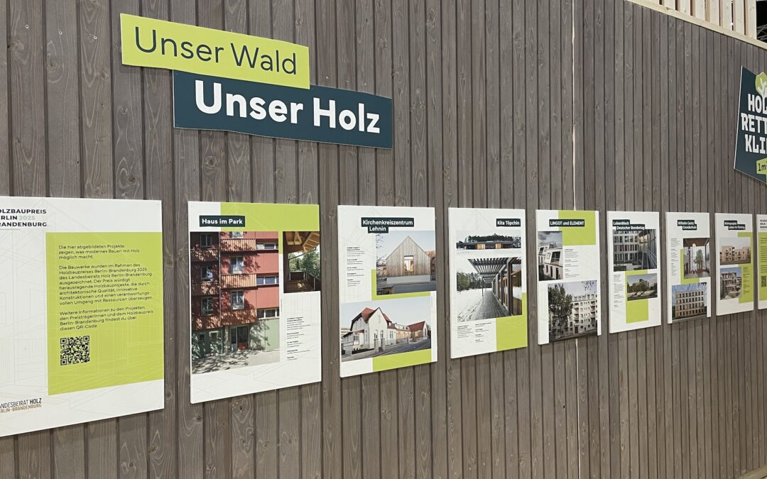 Der Landesbeirat Holz Berlin-Brandenburg hat den Auftritt inhaltlich unterstützt und einen Beitrag zur Sichtbarkeit des Holzbaus geleistet. Für den Stand wurden Preisträgerprojekte des Holzbaupreises Berlin-Brandenburg 2025, den der Landesbeirat Holz ausgelobt hat, für eine Ausstellung zur Verfügung gestellt. So konnten Besucherinnen und Besucher konkrete Beispiele aus Berlin und Brandenburg sehen: realisierte Projekte, die zeigen, wie Holzbau in unterschiedlichen Typologien und Maßstäben heute bereits umgesetzt wird.